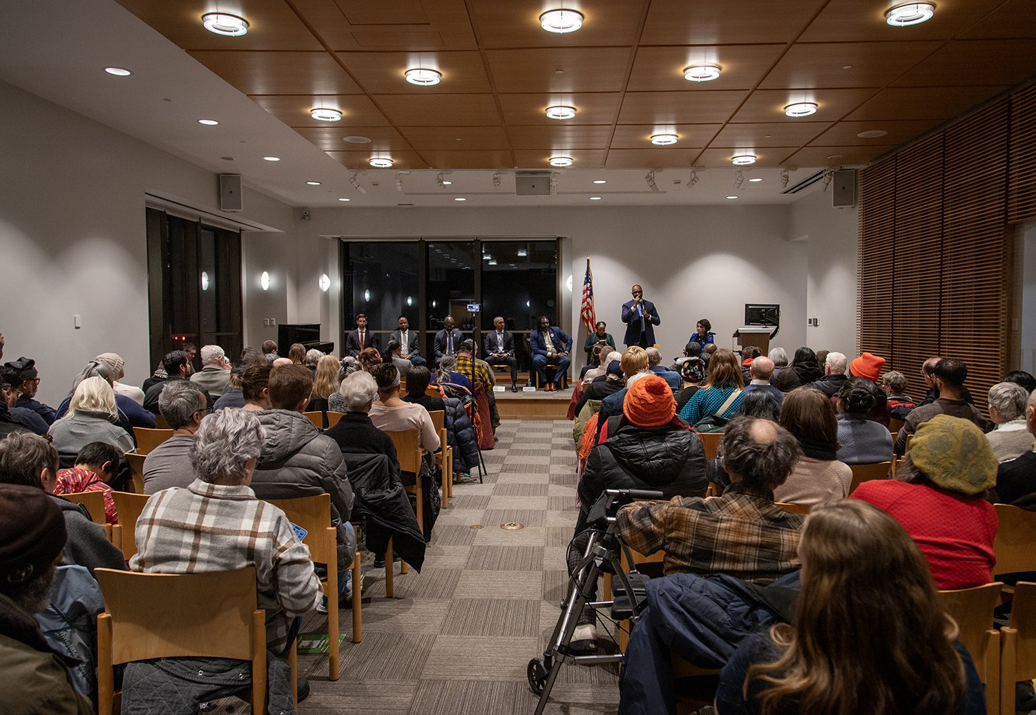 (Left to Right) Reed Showalter, Rory Hoskins, La Shawn Ford, Thomas Fisher, Anthony Driver, Kina Collins, Richard Boykin and the moderator, IL PNHP member Dr Monica Maalouf